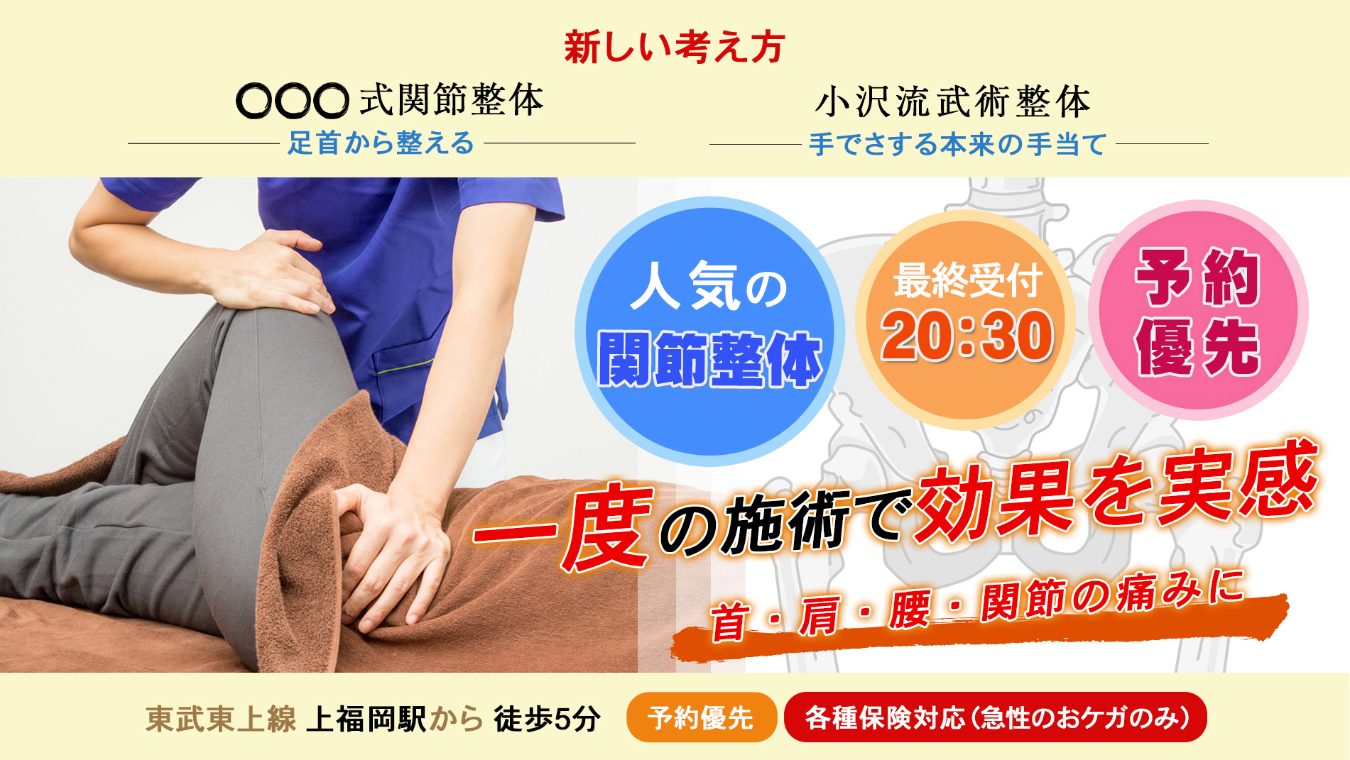 関節整体を中心に、患者様1人1人の施術を提案。改善できなかった痛みにも効果的。国家資格者による本格施術で安心!!